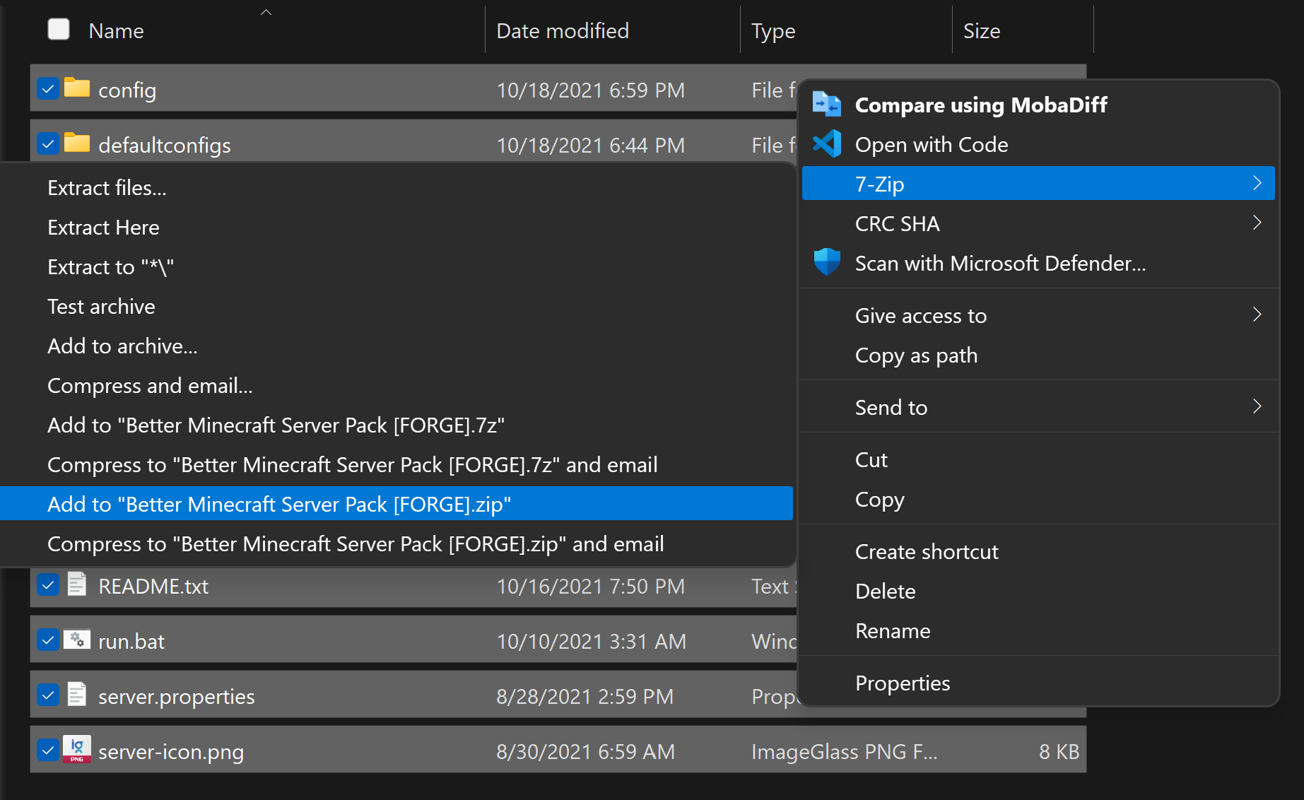 After sucessfully installing Forge, you will need to select all files in the directory and compress them. It's recommended you use a tool like 7Zip to compress the files, since Windows default compression option doesn't usually work with the panel.