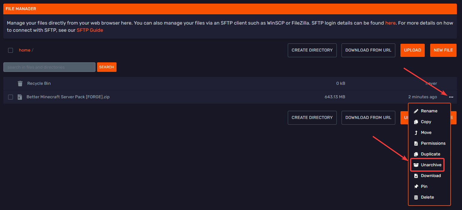 Server packs contain a lot of files, so you will need to connect through SFTP to upload the archived file. You can follow our guide on How to connect through SFTP. After you connect through SFTP, you can just drag and drop the .zip to the SFTP server.